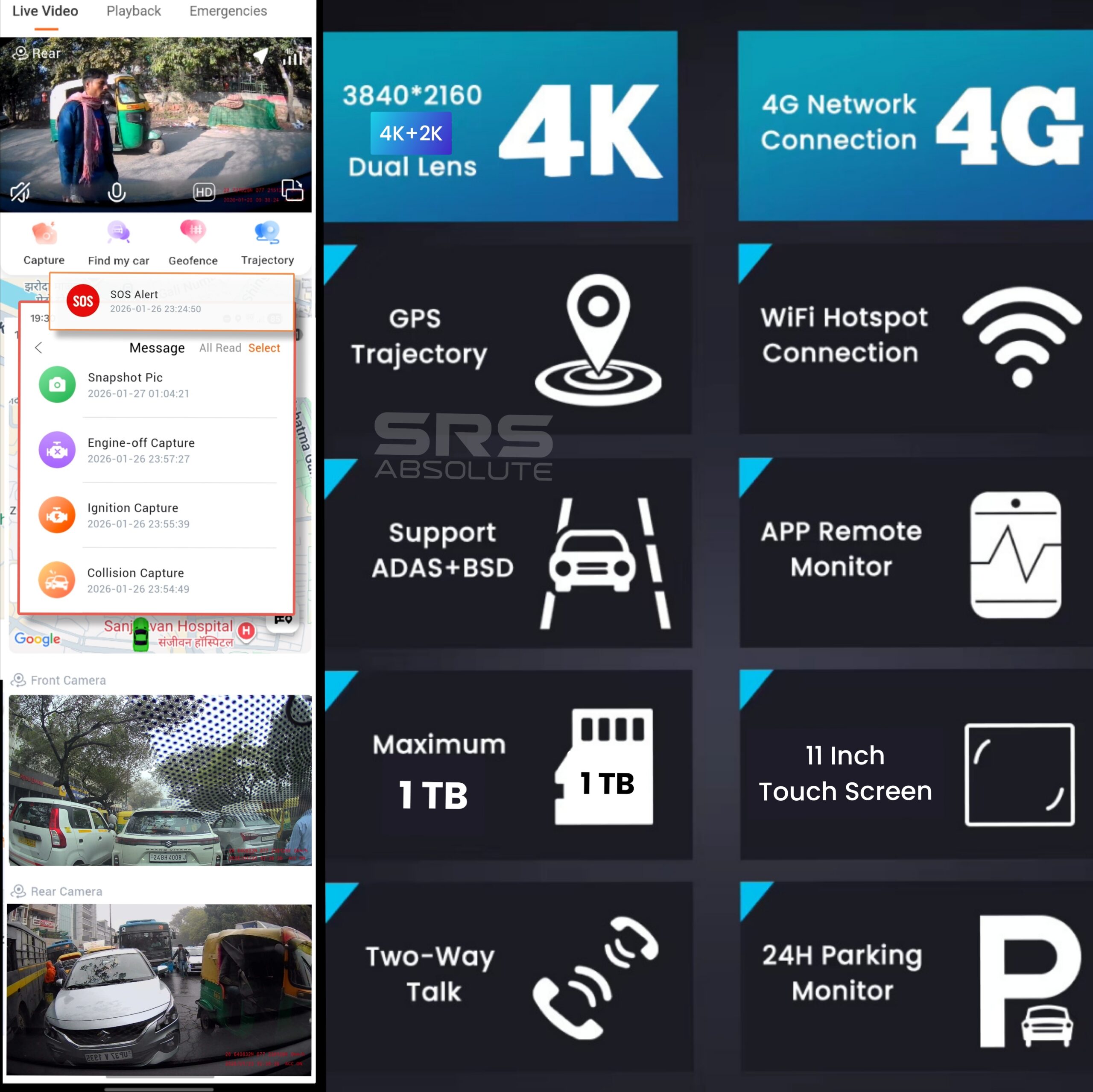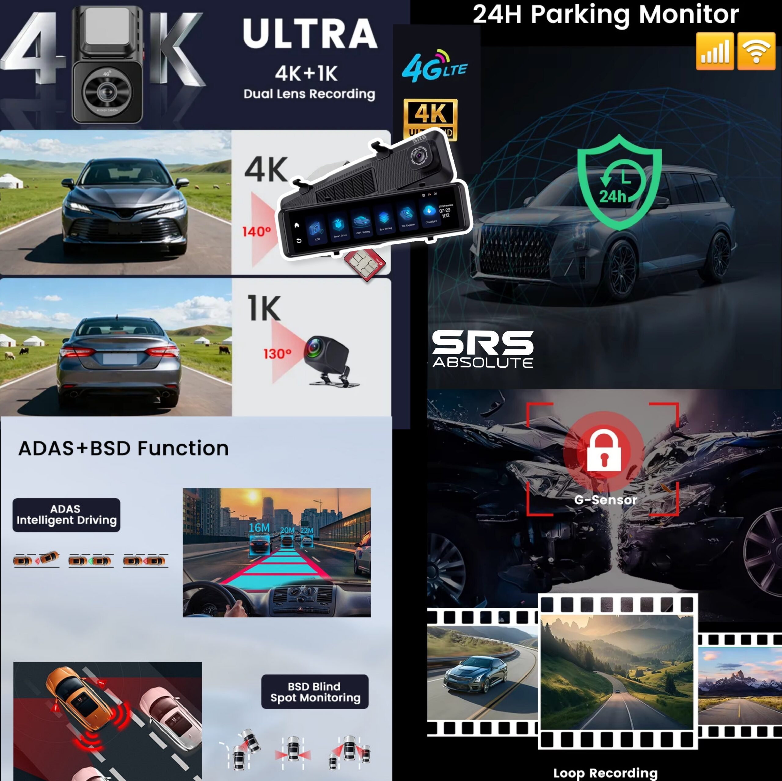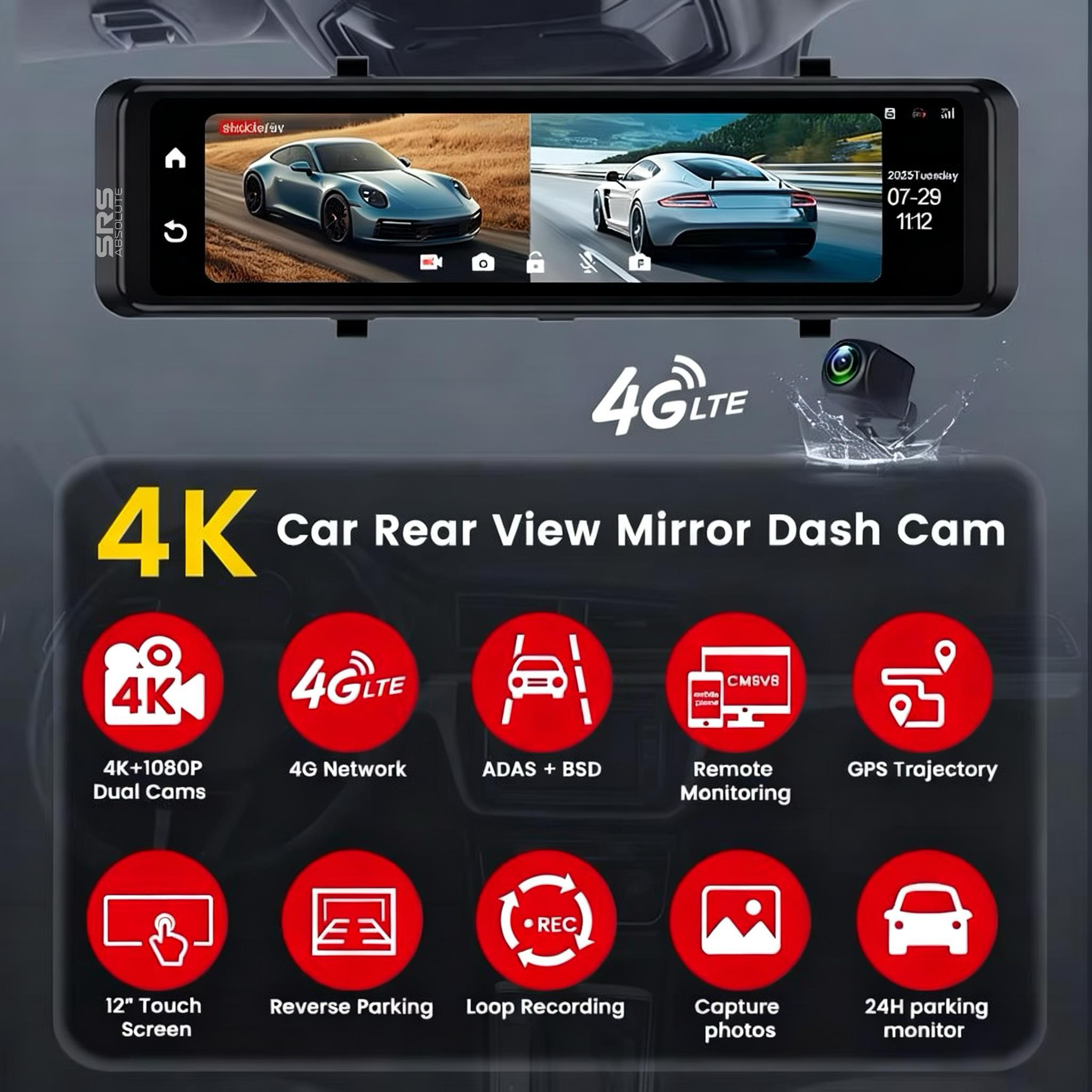 SRSABSOLUTE 4K 4G Dual Dash Cam GPS+LiveVideo ADAS BSD Remote Tracking Playback Park Monitor Calling Pedestrian Alert TimeLapse SOS Loop Record GSensor Reverse Parking SIM MicroSD Support upto 1TB(S124K)