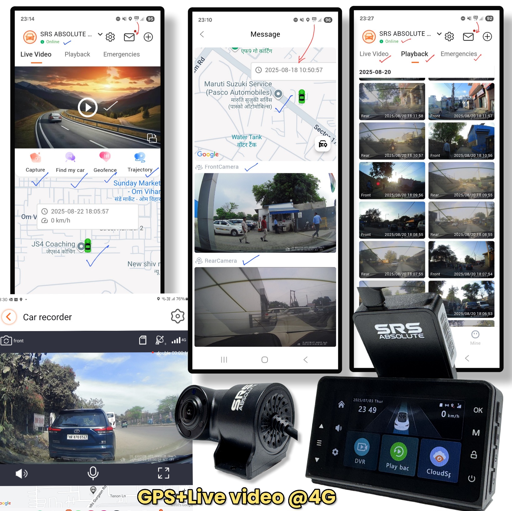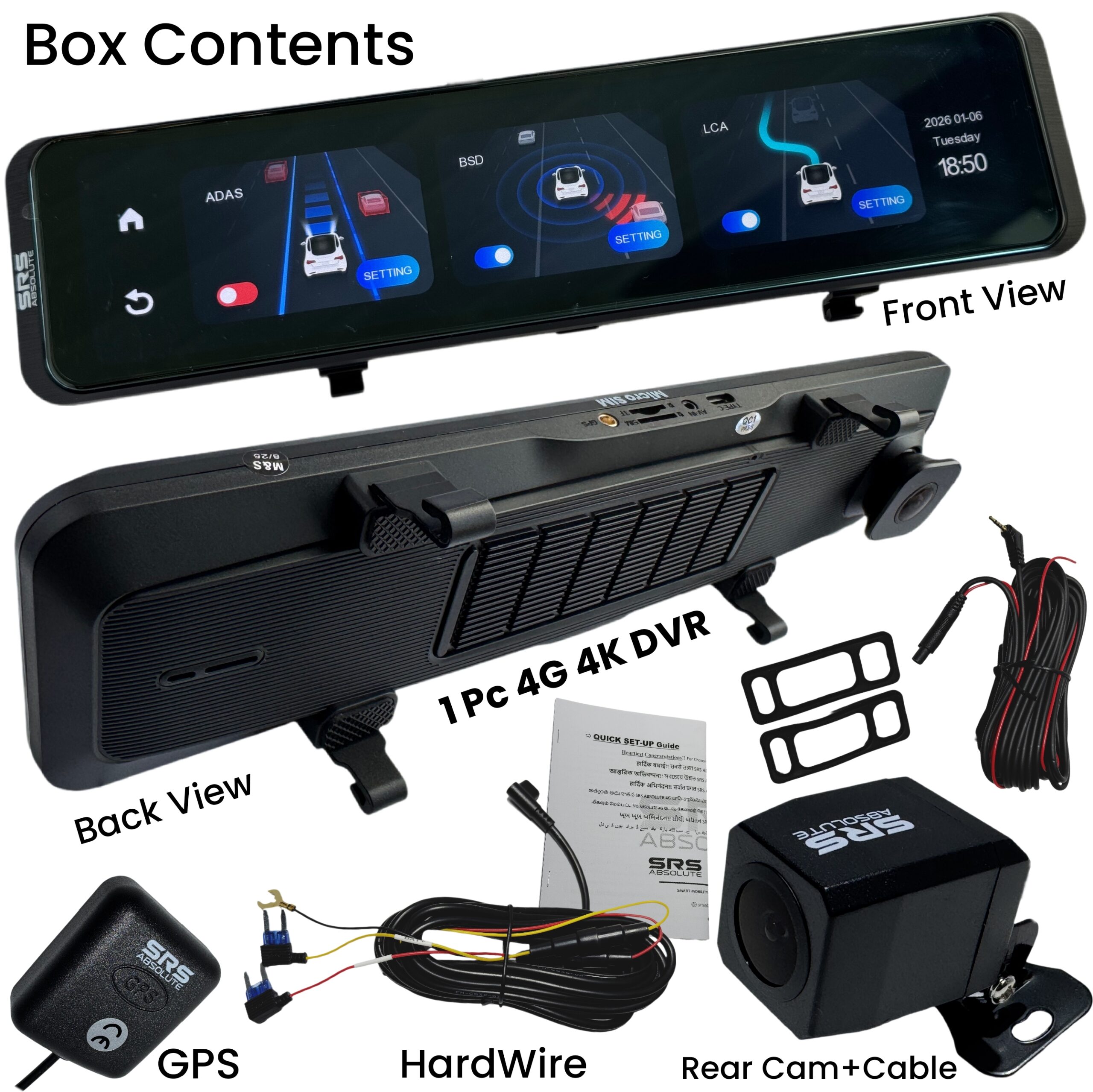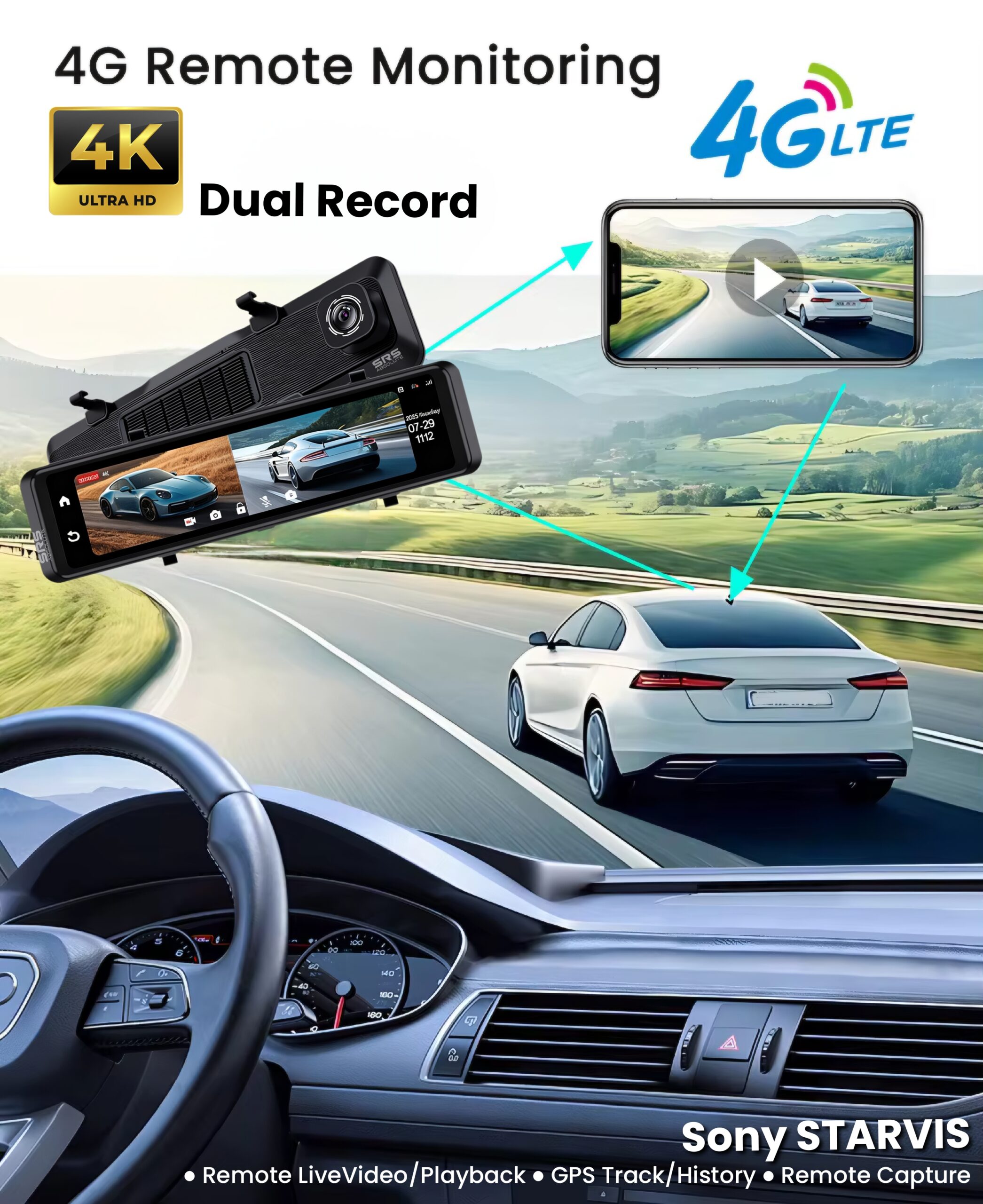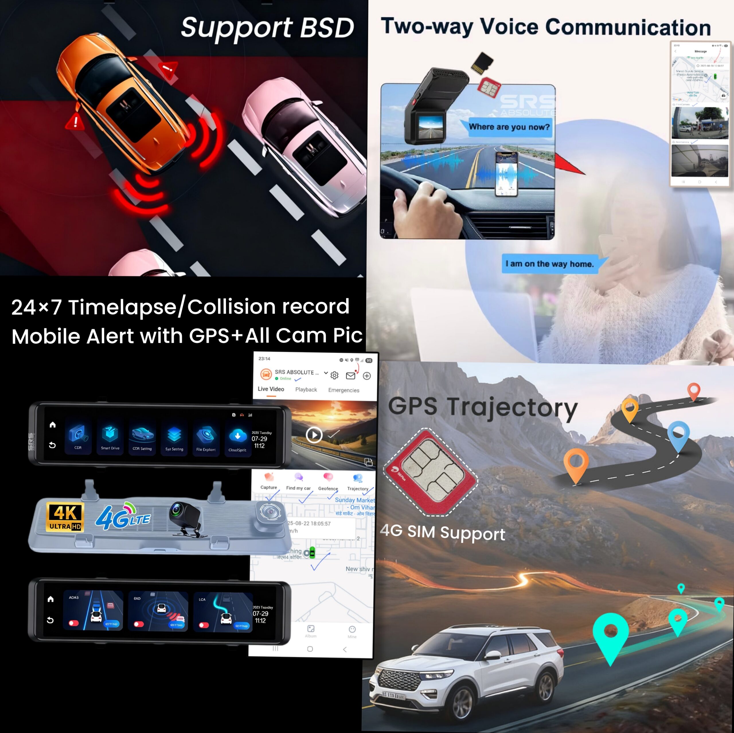 SRSABSOLUTE 4K 4G Dual Dash Cam GPS+LiveVideo ADAS BSD Remote Tracking Playback Park Monitor Calling Pedestrian Alert TimeLapse SOS Loop Record GSensor Reverse Parking SIM MicroSD Support upto 1TB(S124K)