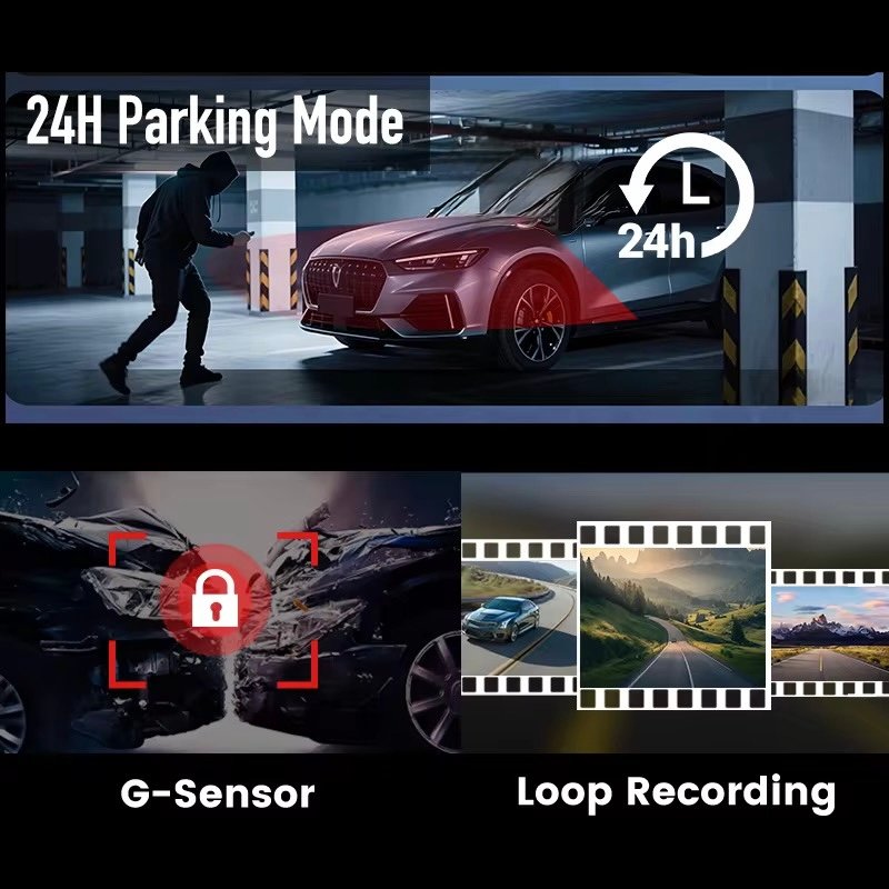 • 24-Hour Remote Live Monitoring Security: Features Collision Sensor, Continuous Front, Inside/Cabin & Back Recording, Remote Wake up, Privacy control options & Live stream, Loop Recording, Emergency Recording, built-in G-Sensor/Collision Sensor, built-in TimeLapse recording (configurable), GSM/WCDMA/LTE TDD/LTE FDD network Supported, Front Collision Warning Alert/Remote Mobile Notification, Engine Start/Ignition Capture/Alert/Remote Mobile Notification, Engine Shutdown Capture/Remote Mobile Notification, and Fatigue Driving Detection Alert/Remote Mobile Notification